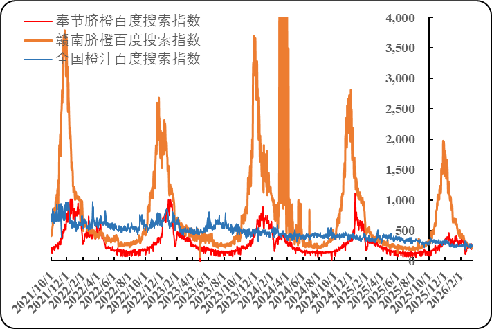 气温仅是震荡回升,叠加橙汁终端消费增量不及预期,使得橙汁互联网搜索指数仅是窄幅震荡;同期,品牌化的奉节脐橙互联网搜索指数维持上涨走势。具体来看,当周奉节脐橙百度搜索指数均值为237.43点,环比上涨1.16%,同比(2025年3月10日,下同)仍下跌14.29%;赣南脐橙百度搜索指数均值为222.71点,环比下跌8.40%,同比下跌37.81%;全国橙汁百度搜索指数均值为242.71点,环比上涨0.77%,同比跌幅扩大至41.57%。同期,冷冻浓缩橙汁现货期货价格走势分化,期现差扩大至4154.86元/吨,环比上涨18.21%。