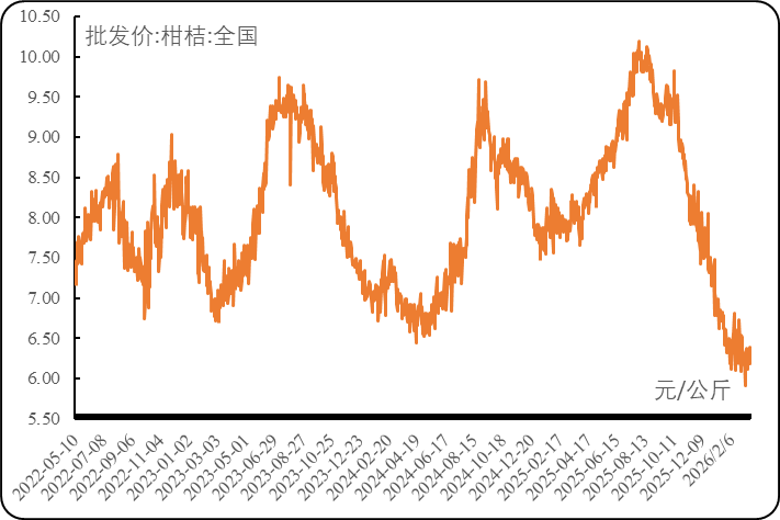 国内柑橘产量稳步提升,叠加不易剥皮的鲜橙消费缩量,还有销售比重向电商平台倾斜导致产地出货承压,综合使得全国柑橘销地价相对低位,各主流品种也仅是在销售后期行情有所回升。近期全国柑橘各主流品种销地价继续走弱,不耐储藏的宽皮柑橘和集中上市的沃柑跌幅居前。回到产地,气温震荡回升也对“挂树保鲜”的三峡库区脐橙销售提出挑战,出货承压导致产地价开始震荡走弱;销售进入尾声的赣南脐橙出货价继续偏强运行。