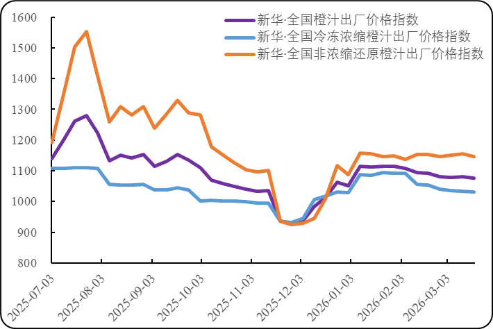 备注:基于价格数据反映出市场规律,指数基期调整为2025年12月,基点1000点;结合美国农业部外国农业服务局(USDA-FAS)报告中我国冷冻浓缩橙汁产量数据、国内行业机构测算的非浓缩还原橙汁产量数据,以14:3的比重统一折算为所需加工果数量,权重固定为61.65%:38.35%。